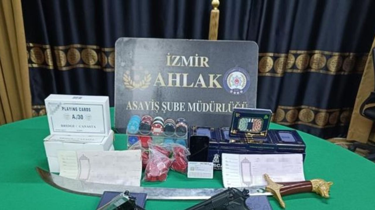 İzmir Asayiş Şube Müdürlüğü Ahlak Büro Amirliği ekipleri, Karabağlar ilçesi Selvili Mahallesi'nde bulunan ruhsatsız iş yerinde kumar oynandığı ihbarı üzerine harekete geçti. Ekipler tarafından adrese yapılan operasyon kapsamında adreste arama yapıldı. Gerçekleştirilen aramada, 2 adet ruhsatsız tabanca ve tabancalara ait toplam 24 adet farklı ölçülerde fişek, 80 santim uzunluğuna sahip kılıç, 10 adet yeşil reçeteye tabi sentetik hap, 2 farklı şahıs adına düzenlenmiş 920 bin TL bedelli borç senedi, 580 adet para yerine geçen çip, 40 kutu iskambil oyun kağıdı, 8 adet özel yapım barbut zarı ele geçirildi.