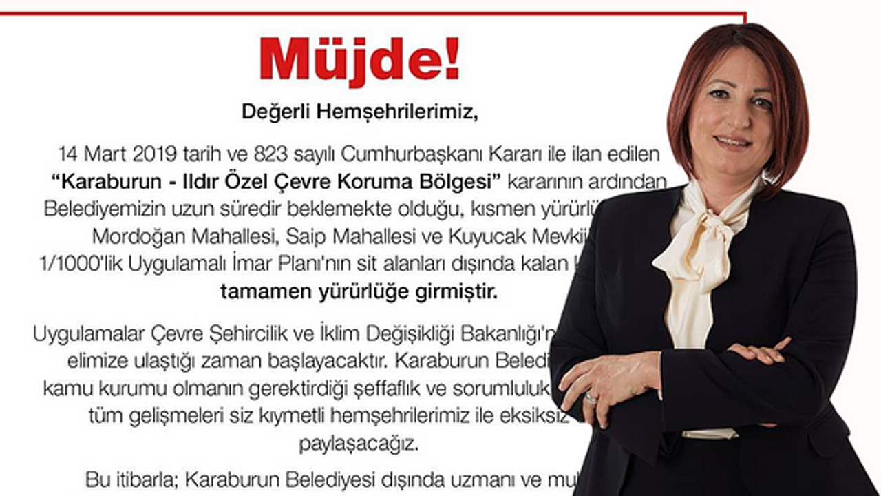 Kişisel sosyal medya hesaplarından bir mesaj yayınlayarak Karaburun’da yaşayanlara bilgiler veren Başkan Erdoğan, “14 Mart 2019 tarih ve 823 sayılı Cumhurbaşkanı Kararı ile ilan edilen “Karaburun- Ildır Özel Çevre Koruma Bölgesi” kararının ardından Belediyemizin uzun süredir beklemekte olduğu, kısmen yürürlükte olan Mordoğan Mahallesi, Saip Mahallesi ve Kuyucak Mevkii’nde 1/1000'lik Uygulamalı İmar Planı'nın sit alanları dışında kalan kısımlarında tamamen yürürlüğe girmiştir. Uygulamalar Çevre Şehircilik ve İklim Değişikliği Bakanlığı'ndan resmi yazı elimize ulaştığı zaman başlayacaktır” ifadelerini kullandı.