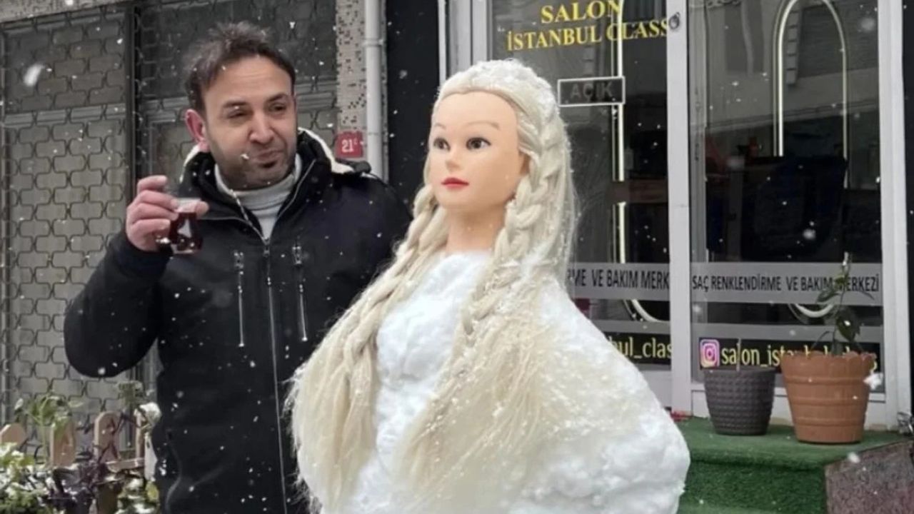 Bekir Gök ve komşuları, çevredeki karı toplayarak iş yerinin önüne dikkat çeken bir kardan gelin yaptı. Beyaz elbise formunda tasarlanan ve plastik bir gövdeye sahip olan kardan gelin, mahalle sakinlerinin ilgisini çekti. Birçok kişi, bu ilginç figürle fotoğraf çekerek anı ölümseme fırsatı buldu. Ancak, bu güzel görüntü uzun süre devam edemedi.