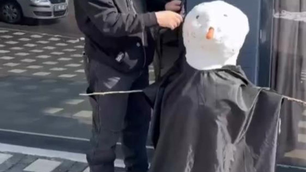 Soğuk havada müşteri bulamayan bir berber, yaratıcılığını konuşturdu. Dükkanının önüne yaptığı kardan adama önlük giydiren esnaf, kardan adamı tıraş ederek hem saç hem de sakal bakımını yaptı. Bu eğlenceli anlar, çevredeki kameralara yansıdı ve vatandaşlar arasında keyifli bir gülüşme sebebi oldu.