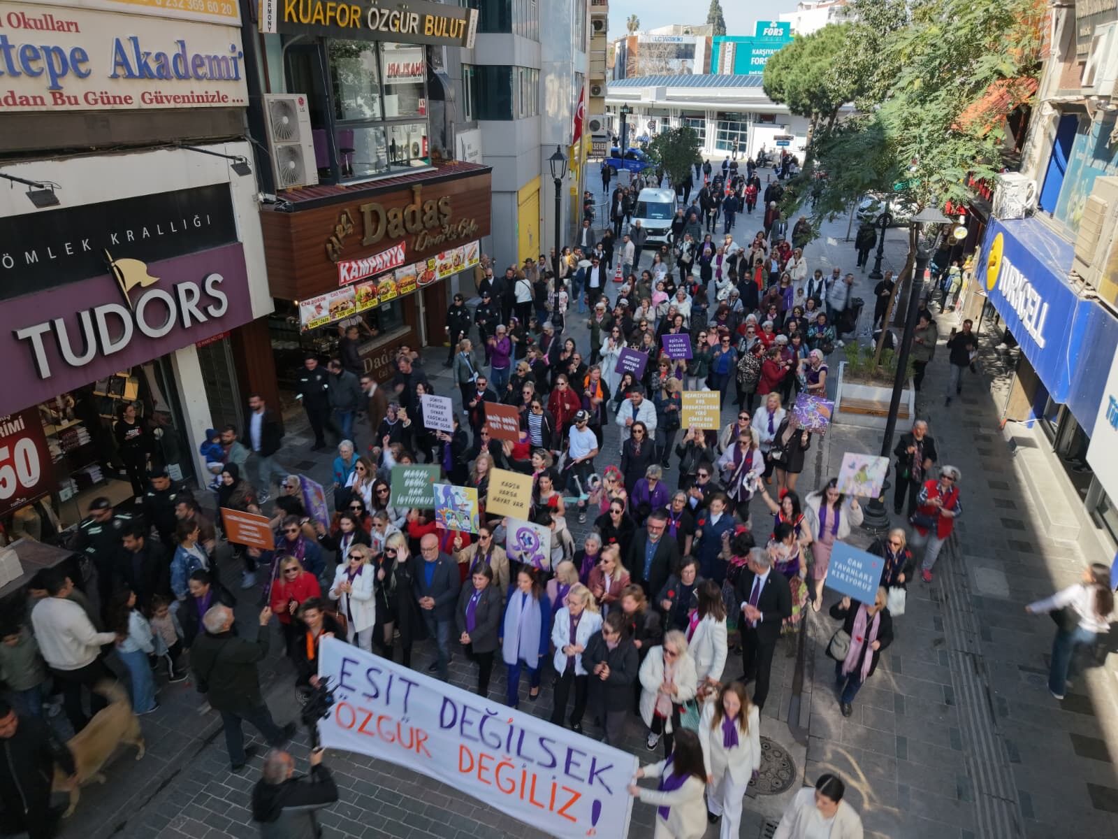 Resmi törenlerin ardından Karşıyaka sokakları, binlerce kişinin katıldığı coşkulu bir dayanışma yürüyüşüne sahne oldu. Belediye hizmet binası önünde toplanan kortej, toplumsal cinsiyet eşitliğini savunan dövizler ve "şiddete hayır" sloganları eşliğinde Hergele Meydanı’na kadar yürüdü. Belediye Bandosu’nun marşlarıyla ritim kazanan yürüyüş, bölge sakinlerinin de balkonlarından verdiği destekle büyük bir gövde gösterisine dönüştü. Yürüyüşün sonunda sahnelenen halk oyunları gösterileri ve hep bir ağızdan söylenen İzmir Marşı, ilçedeki birlik ve beraberlik ruhunu pekiştirdi.