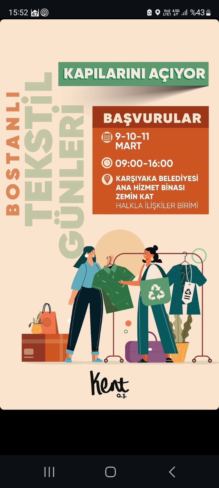 Son gelişme olarak Karşıyaka Belediyesi iştiraki Kent A.Ş., Bostanlı’da planlanan “tekstil günleri” için başvuru ilanı yayımladı. Buna göre başvuruların 9, 10 ve 11 Mart tarihlerinde alınacağı bildirildi.