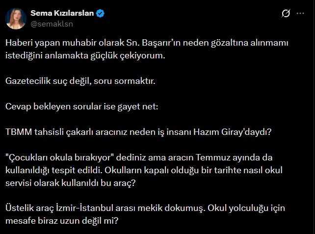 GDH muhabiri Sema Kızılarslan ise Başarır’ın suçlamalarına sosyal medya üzerinden yanıt verdi. Kızılarslan, gazeteciliğin suç değil soru sorma işi olduğunu vurgulayarak şu soruları yöneltti: