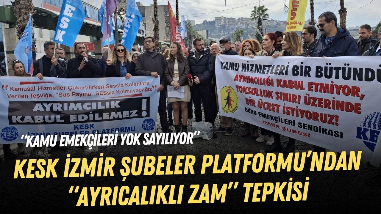 Son Mühür / Yağmur Daştan - 2026 Yılı Merkezi Yönetim Bütçe Kanunu görüşmeleri kapsamında 1 Aralık 2025 tarihinde TBMM Plan ve Bütçe Komisyonu’nda üst düzey kamu yöneticileri ile uzman, denetçi, müfettiş gibi bazı meslek kadrolarında bulunanların maaş/ücretlerini artıracak şekilde verilen önerge kabul edildi. Verilen önergeye karşı ‘Kamu hizmetleri bir bütündür, ayrımcılığı kabul etmiyor yoksulluk sınırı üzerinde bir ücret istiyoruz’ mesajı veren KESK İzmir Şubeler Platformu, Konak’ta bir basın açıklaması düzenledi. Basın açıklamasında, kamuda ayrımcılığın iş barışını bozacağını söyleyen KESK İzmir Şubeler Platformu üyeleri, kamu emekçilerinin taleplerini de tek tek sıraladı.