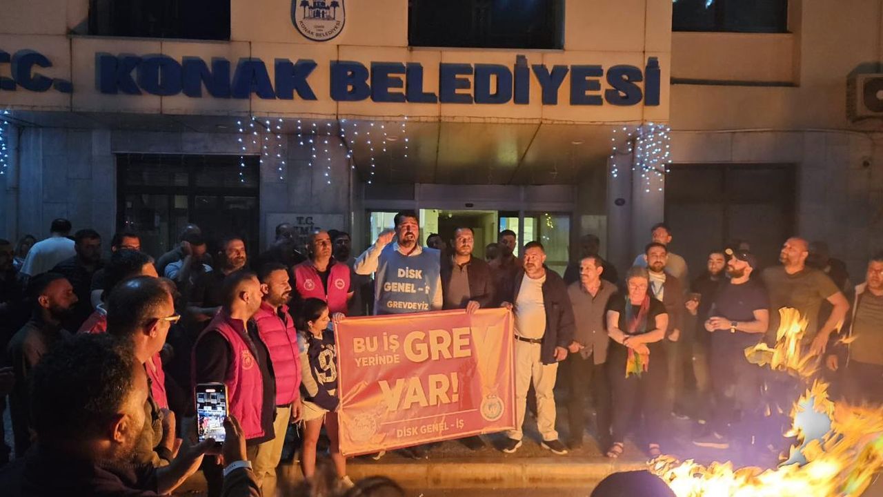 Başta Konak Belediyesi'nin ana hizmet binası olmak üzere Fen İşleri ,Ulaşım Müdürlüğü ve Temizlik İşleri'ne saatler 00.00'ı gösterdiğinde grev pankartı asıldı. ''Bu iş yerinde grev vardır!'' pankartını asan işçiler, ateş yakıp halay çektiler. Yaklaşık 1500'e yakın işçinin greve başlamasıyla birlikte, başta temizlik işleri ve fen işleri olmak üzere hizmet durmuş oldu.