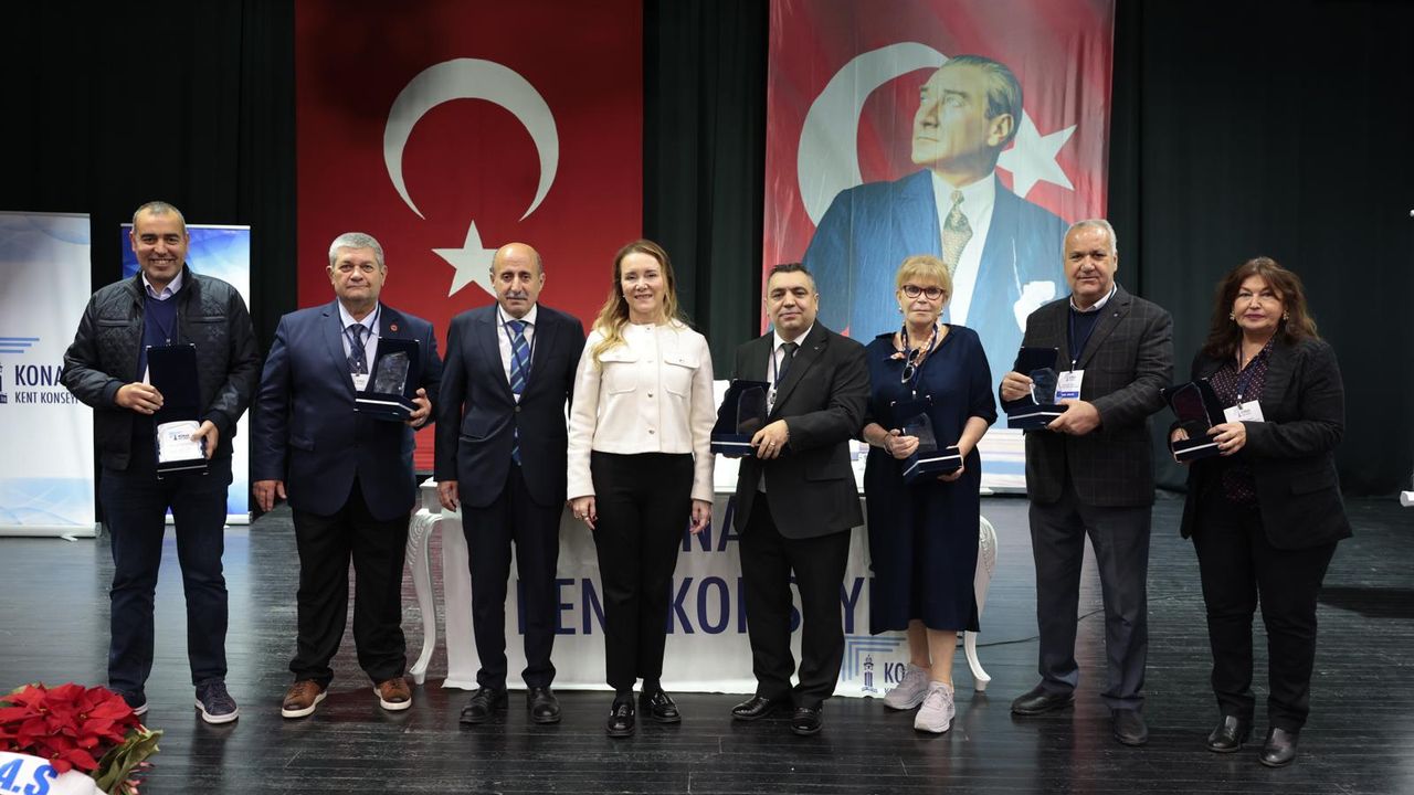 Konak Kent Konseyi Başkanı Hamit Mumcu, konseye sağlanan destekler nedeniyle Konak Belediye Başkanı Nilüfer Çınarlı Mutlu’ya teşekkür plaketi sundu. Başkan Mutlu da 2022-2025 döneminde görev yapan yürütme kurulu üyelerine katkıları dolayısıyla plaket verdi.