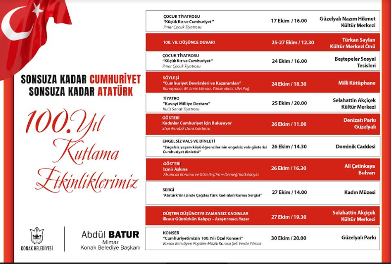 17 Ekim’de Güzelyalı Nazım Hikmet Kültür Merkezi’ndeki “Küçük Kız ve Cumhuriyet” isimli çocuk tiyatrosuyla başlayan etkinlikler, 24 Ekim’de Milli Kütüphane’de düzenlenecek “Cumhuriyet Devrimleri ve Kazanımları” söyleşisiyle devam edecek. İzmir Milli Kütüphane Vakfı Başkanı ve Konak Belediyesi Meclis Üyesi Ulvi Puğ’un yöneteceği söyleşide Tarihçi Yazar Doç. Dr. M. Emin Elmacı konuşacak. “Küçük Kız ve Cumhuriyet” çocuk tiyatrosu, 24 Ekim’de Beştepeler Sosyal Tesisleri’nde tekrar sahnelenecek. Kutlamalar kapsamına, “Kuvayi Milliye Destanı” isimli tiyatro oyunu Selahattin Akçiçek Gösteri Merkezi’nde 25 Ekim’de sahnelenirken, 26 Ekim günü “Kadınlar Cumhuriyet İçin Buluşuyor” isimli step, aerobik dans gösterisi Güzelyalı Denizatı Parkı’nda yapılacak.