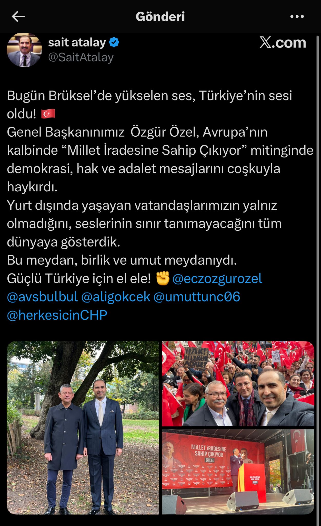 CHP’li isim Sait Atalay’ın sosyal medya hesabından yaptığı paylaşımda, Brüksel’deki mitingden fotoğraflar yer aldı. Fotoğraflarda Umut Tunç’un, Genel Başkan Özgür Özel ve partili yöneticilerle birlikte yer aldığı görüldü. Atalay paylaşımında, “Bugün Brüksel’de yükselen ses, Türkiye’nin sesi oldu” ifadelerini kullandı.