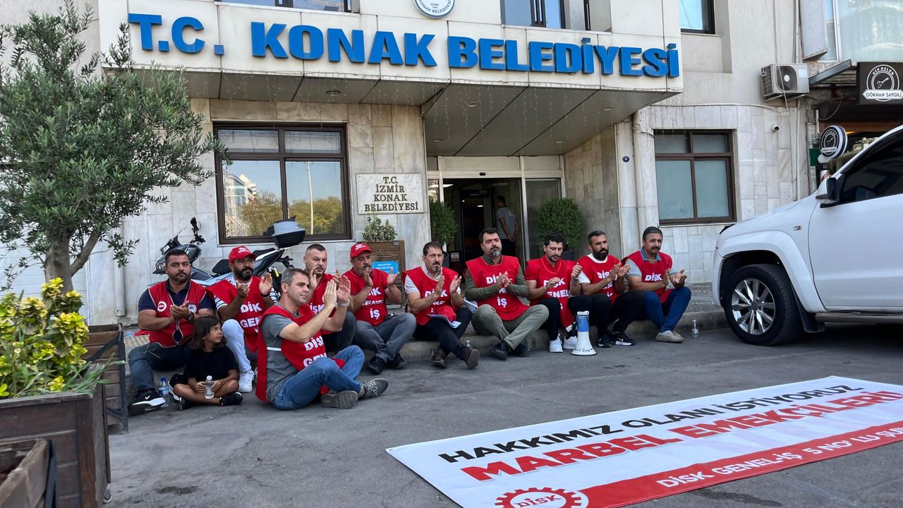 Son Mühür/ Emine Kulak - İzmir’in Konak ilçesinde belediye iştiraki Merbel A.Ş.’de çalışan işçiler, bugün sabah saatlerinde Konak Belediyesi binası önünde kitlesel bir eylem gerçekleştirdi. DİSK'e bağlı Genel-İş Sendikası 5 No’lu Şube öncülüğünde yapılan eylemde işçiler, "Emek yoksa barış da yok", "İnsanca yaşam istiyoruz" sloganları attı.