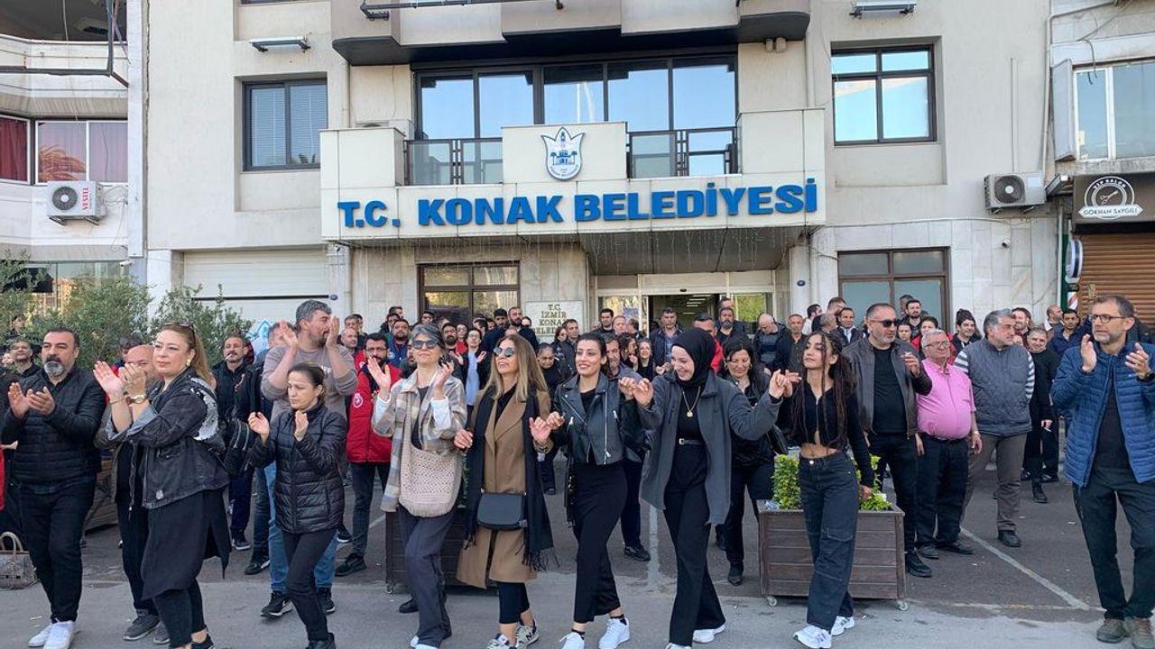 Son Mühür / Arif Enes Durak - Sabah saatlerinde Konak Belediye Binası önünde toplanan işçiler, halaylar çekerek, danslar ederek eylem gerçekleştirdi. İşçiler sık sık; “İş, ekmek yoksa hizmet de yok” ve “İnadına sendika, inadına DİSK”, "Direne direne kazanacağız", "Sadaka değil toplu sözleşme" sloganları attı.