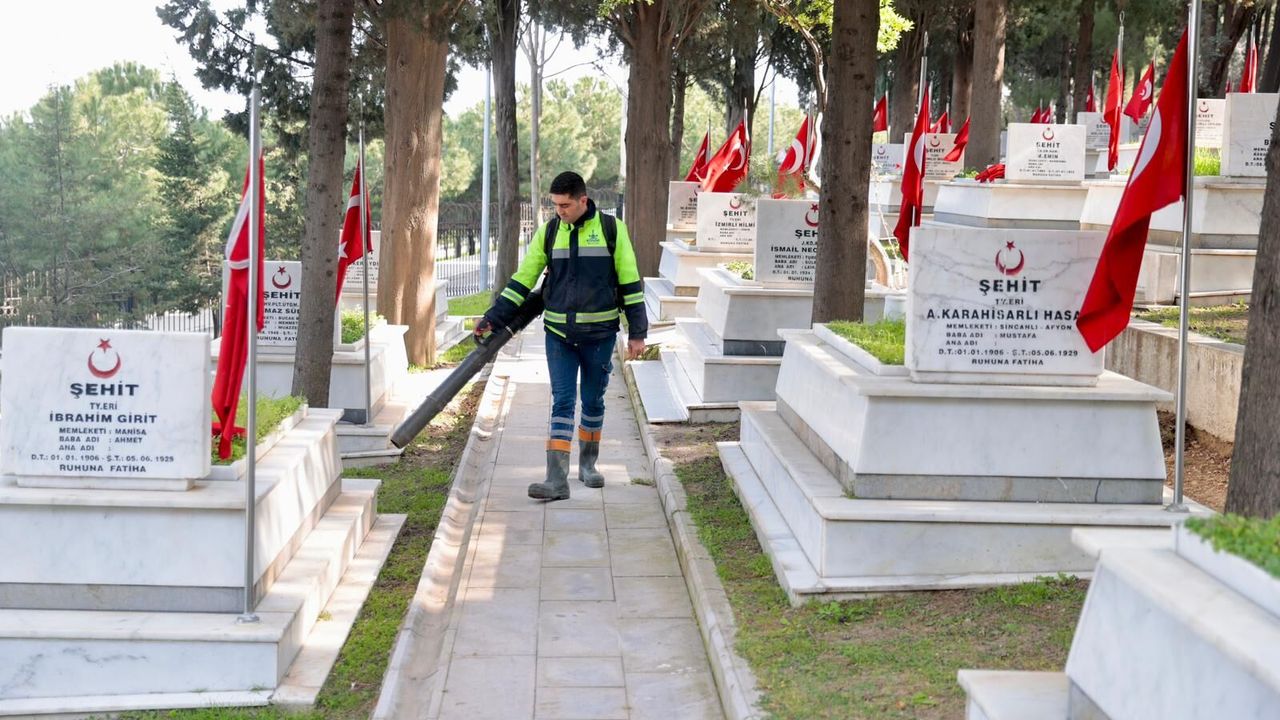 Konak Belediyesi ekipleri, belirlenen üç şehitlikte eş zamanlı olarak yürüttüğü çalışmalarda kabirleri tek tek elden geçirdi.