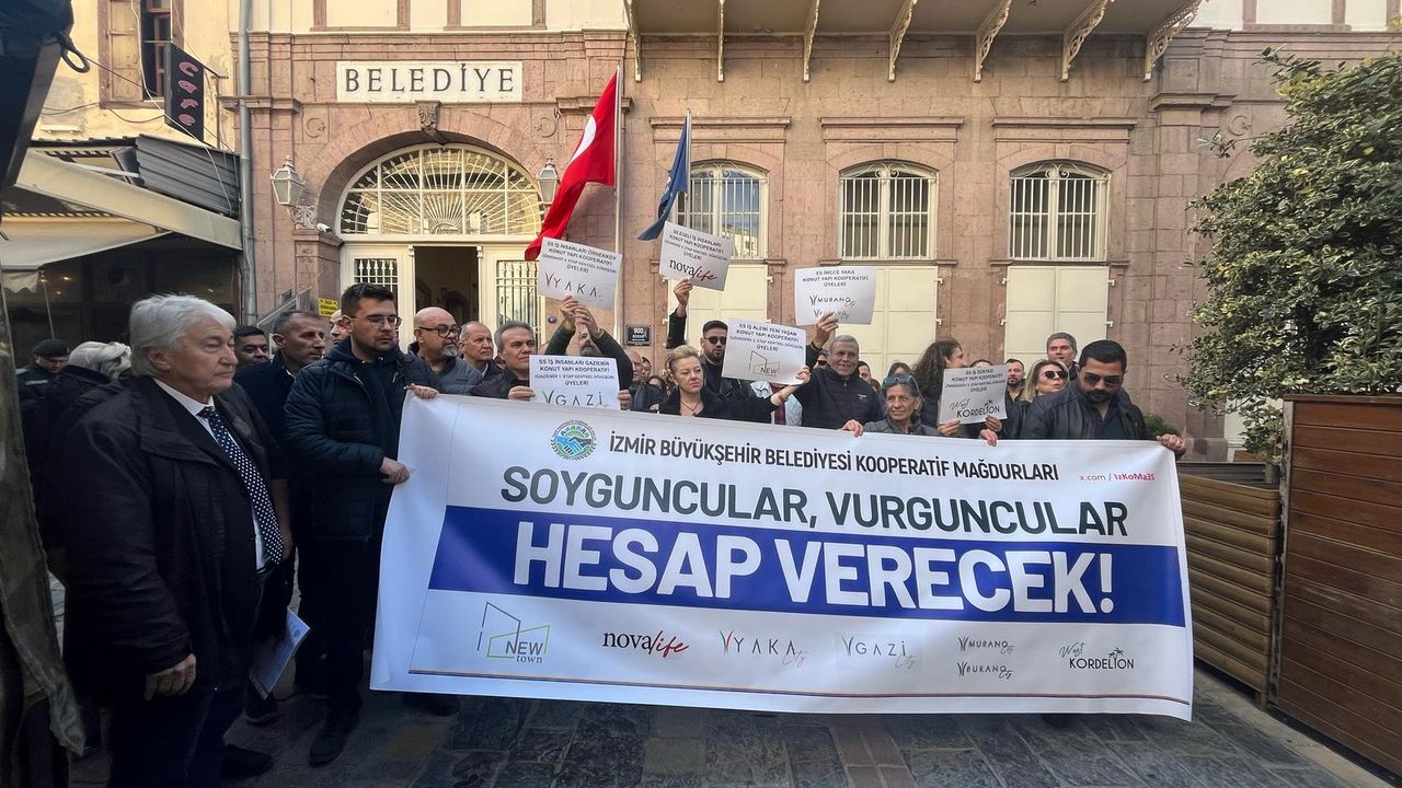 İzmir Kooperatif Mağdurları Birliği adına konuşan Yaka City Kooperatifi Başkanı Kadir Özkan, Bizler, "İzmir Büyükşehir Belediyesinin garantörlüğünde kurdurulan, CHP’nin il başkanlarının ve İzmirli sanayici iş insanlarının kurduğu kentsel dönüşüm kooperatifleri üyeleriyiz. Hiçbirimiz burada siyasi amaçlarla bulunmuyoruz. Sadece haklarımızı aramak için sesimizi duyurmak istiyoruz! Dönemin Belediye Başkanı Tunç Soyer ve dönemin CHP Genel Başkanı Kemal Kılıçdaroğlu’nun övgülerine ve garanti vermesine istinaden, Türkiye’nin 3. büyük şehrinin en büyük Kamu Kurumu olan İzmir Belediyesi’ne güvenerek bu kooperatiflere üye olduk ve inşaatları finanse ettik. Zaman içinde inşaatlarımızın akıbetini araştırırken birçok usulsüzlükle karşılaştık. Bunları mevcut Belediye Başkanımız Sayın Cemil Tugay’a aktarmak ve çözüm bulmasını rica etmek istedik. Ancak aradan geçen 10 aylık süre içinde gördük ki Sayın Cemil Tugay yönetimindeki Büyükşehir Belediyesinin temsilcileri, süreci adeta tıkamakta ve kooperatiflerin eski yönetimlerinin yarattığı zararları üyelere ödetmeye çalışmaktadır. Bizler artık, yetkisiz avukat ve başkan yardımcıları aracılığıyla yürütülen görüşmelere katılarak daha fazla zaman kaybetmek istemiyoruz. İzmir Büyükşehir Belediye Başkanı Sayın Cemil Tugay, görsel ve yazılı basında her fırsatta üyelerin haklarını yasal faizi ile birlikte ödeyeceğini ifade etmesine rağmen bunu nasıl yapacağını açıklamayıp, bizlere karşı farklı tavır sergilemiştir. Kendisine çağrımız bu sorunu nasıl çözeceğini hukuksal dayanaklarıyla birlikte ve detayları ile açıklamasıdır. Zamanımız daha fazla harcanmadan; vaat edilen, paralarını ödediğimiz evlerimize bir an önce kavuşmak istiyoruz" dedi.