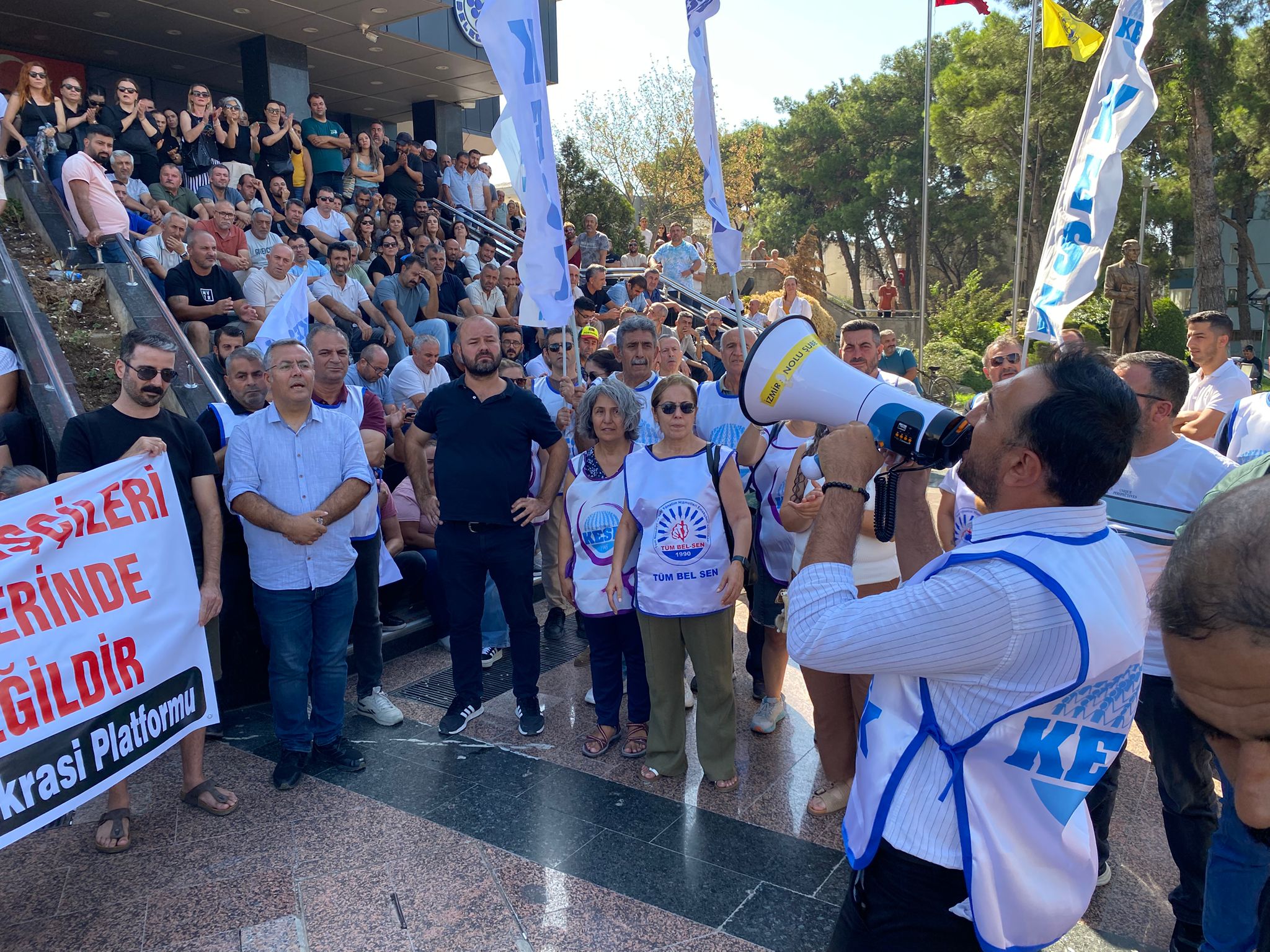 KESK Dönem Yürütme Kurulu Başkanı Turgut Angün, yaptığı konuşmada İzmir genelinde birçok belediyede benzer mağduriyetler yaşandığını belirterek,“İzmir’in birçok belediyesinde işçiler haklarını alamıyor. TİS’ten doğan haklarını alamıyorlar. Biz emekçiler olarak bu tutumu reddediyoruz. Tasarruf deyince ilk önce işçilerin emekleri aklınıza gelmesin. Bu tutumu kabul etmiyoruz. Tasarruf yapacaksanız kendinizin şatafatından tasarruf yapın. Buca belediyesi işçilerinin çocukları boynu bükük okullara gidiyor. Bunun için neden önlem almıyorsunuz. Belediye idaresi üzerine düşeni yerine getirmediği gibi emekçileri baskıyla mücadelesinden vazgeçirmeye çalışıyor. Bizler mücadelemize sahip çıkacağız” dedi.
