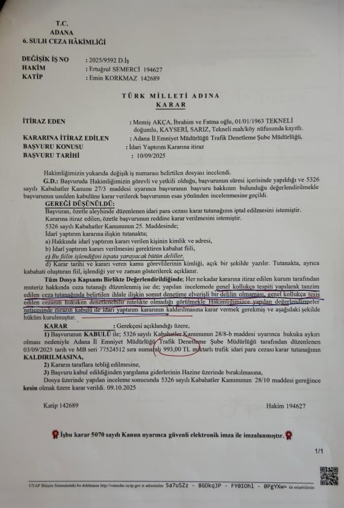 Subaşı’nın incelemesinde cezanın, trafik polisi olmayan bir genel kolluk görevlisi tarafından yazıldığı ortaya çıktı. Bunun üzerine Avukat Subaşı, Adana 6. Sulh Ceza Hakimliği’ne başvurarak iptal davası açtı.