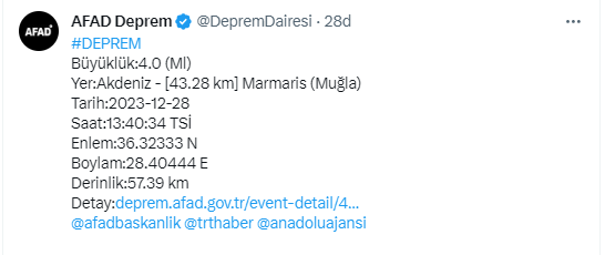 Afet ve Acil Durum Yönetimi Başkanlığının (AFAD) internet sitesinde yer alan bilgiye göre, merkez üssü Muğla'nın Marmaris ilçesi açıkları olan 4 büyüklüğündeki sarsıntı 57,39 kilometre derinlikte gerçekleşti.