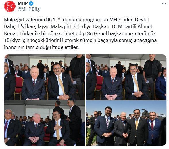 Son Mühür- Malazgirt Zaferi'nin 954. yıl dönümü anma etkinliklerinde, MHP Genel Başkanı Devlet Bahçeli, DEM Partili Malazgirt Belediye Başkanı Ahmet Kenan Türker ile yan yana görüntülendi. MHP’nin resmi sosyal medya hesaplarından paylaşılan fotoğraflarda, Türker’in Bahçeli’ye “Terörsüz Türkiye” süreci için teşekkürlerini ilettiği belirtildi.