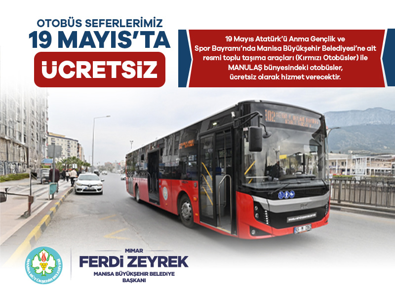 Son Mühür/Osman Günden- Manisa Büyükşehir Belediyesi, 19 Mayıs Atatürk’ü Anma, Gençlik ve Spor Bayramı dolayısıyla kentte düzenlenecek etkinliklere vatandaşların rahatça ulaşabilmesi için şehir içi toplu taşıma araçlarını ücretsiz hizmete sunacak. Uygulama kapsamında, belediyeye ait resmi toplu taşıma araçları ile MANULAŞ bünyesinde hizmet veren kırmızı otobüsler, gün boyunca tüm vatandaşlara ücretsiz hizmet verecek.