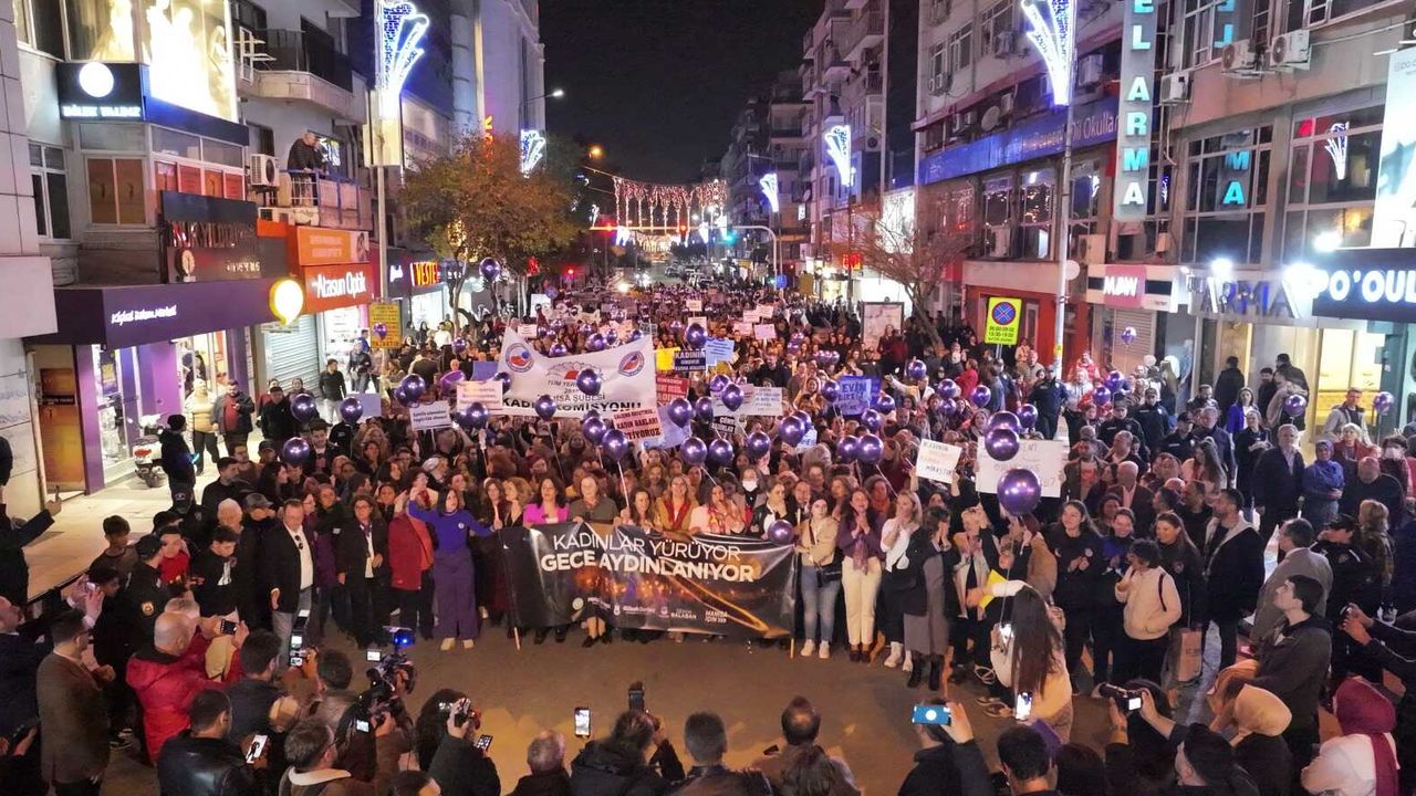 Yüzlerce kadının bir araya geldiği etkinlikte, "Kadın, yaşam, özgürlük", "Hak, hukuk, adalet" ve "Dünya yerinden oynar kadınlar özgür olsa" sloganları yankılandı. Katılımcılar, düdük çalarak ve alkışlarla kadına yönelik şiddete karşı tepkilerini ortaya koydu.