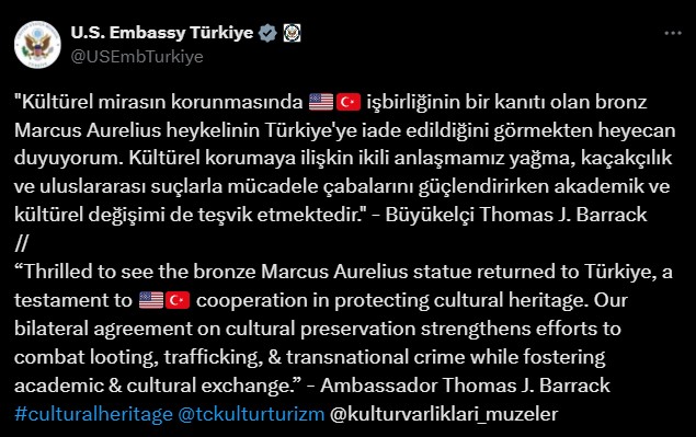 ABD Ankara Büyükelçiliği, bronz Marcus Aurelius heykelinin Türkiye’ye iadesini iki ülke arasında kültürel mirasın korunmasına yönelik işbirliğinin bir kanıtı olarak nitelendirdi. Açıklamada, “Kültürel korumaya ilişkin ikili anlaşmamız, yağma, kaçakçılık ve uluslararası suçlarla mücadele çabalarını güçlendirirken akademik ve kültürel değişimi de teşvik etmektedir” ifadelerine yer verildi.