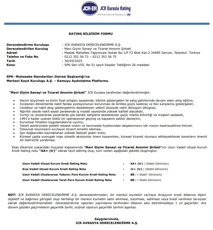 Türkiye’nin halka açık önde gelen hazır giyim perakende markalarından biri olan Mavi Giyim Sanayi ve Ticaret A.Ş. (MAVI) hakkında, 30 Mayıs 2025 tarihinde JCR Avrasya Derecelendirme A.Ş. tarafından Kamuyu Aydınlatma Platformu (KAP) aracılığıyla yayımlanan kredi notu açıklaması, yatırımcılar ve finansal analiz çevreleri tarafından dikkatle takip edildi.