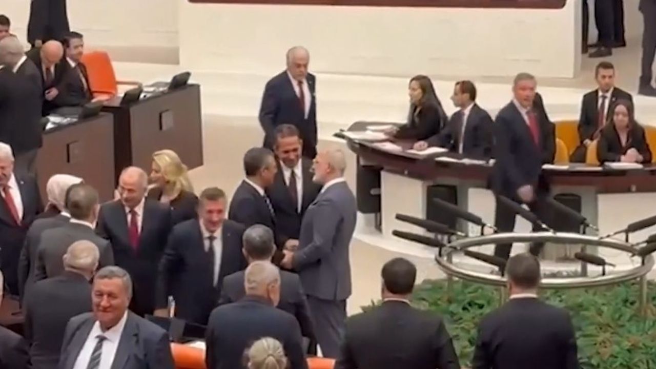 Meclis salonuna ilk gelen lider olarak dikkati çeken MHP lideri Devlet Bahçeli, yanına gelen DEM Parti eş başkanları Tuncer Bakırhan ve Tülay Hatimoğulları'yla tokalaştı.