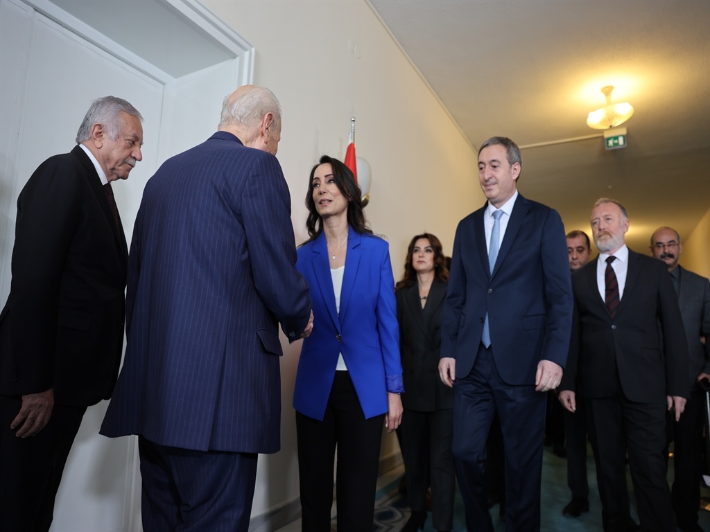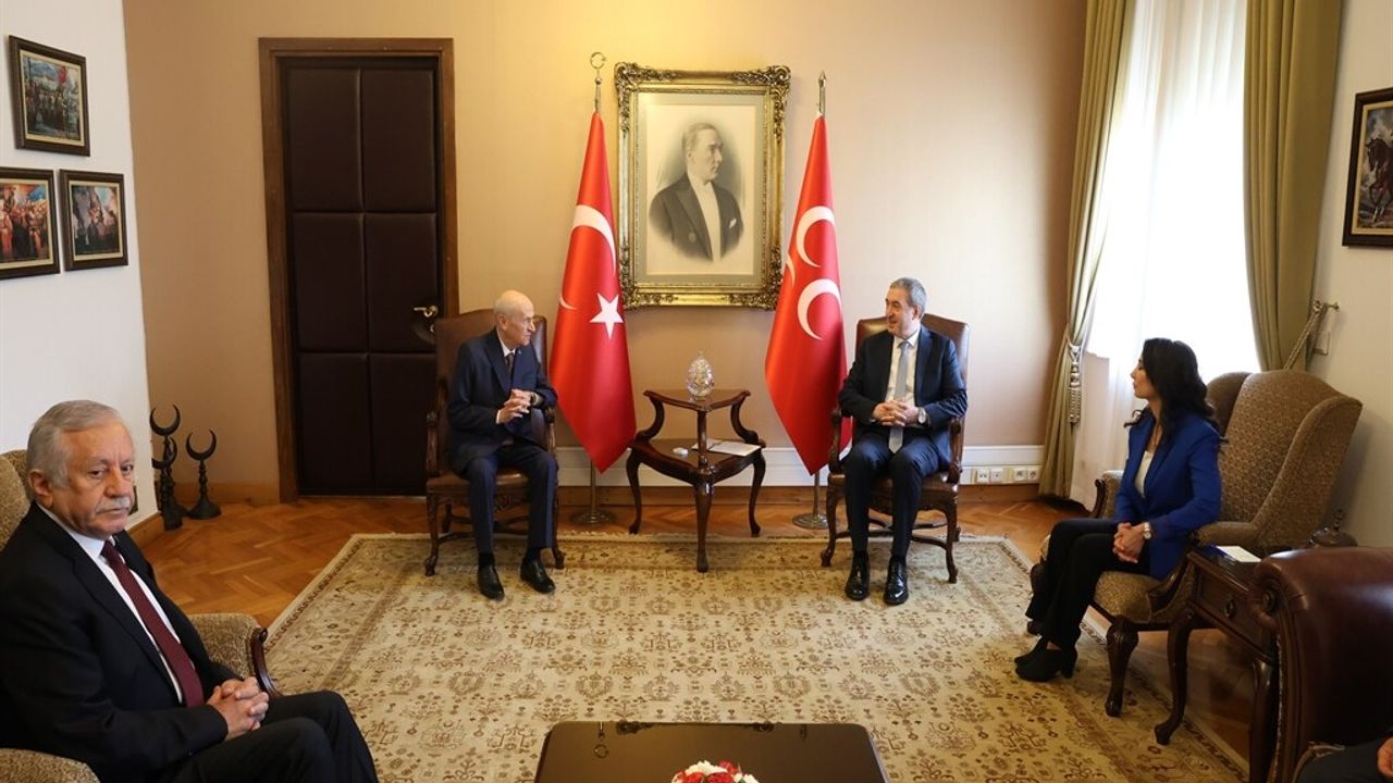 MHP Genel Başkanı Devlet Bahçeli, DEM Parti Eş Genel Başkanları Tuncer Bakırhan ve Tülay Hatimoğulları’nı Türkiye Büyük Millet Meclisi’ndeki makamında kabul etti. DEM Parti heyetinde ayrıca Grup Başkanvekilleri Sezai Temelli ve Gülistan Kılıç Koçyiğit yer aldı. Ziyaret, PKK’nın silah bırakma ve fesih kararının ardından başlatılan siyasi parti görüşmeleri kapsamında gerçekleştirildi.