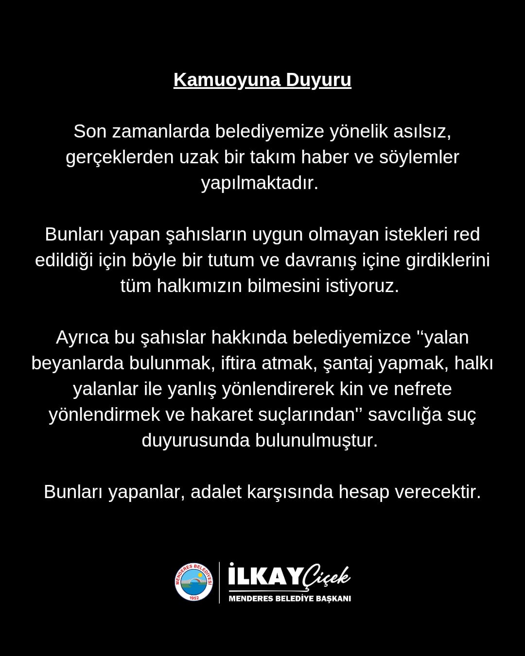 “Son zamanlarda belediyemize yönelik asılsız, gerçeklerden uzak bir takım haber ve söylemler yapılmaktadır. Bunları yapan şahısların uygun olmayan istekleri reddedildiği için böyle bir tutum ve davranış içine girdiklerini tüm halkımızın bilmesini istiyoruz.”