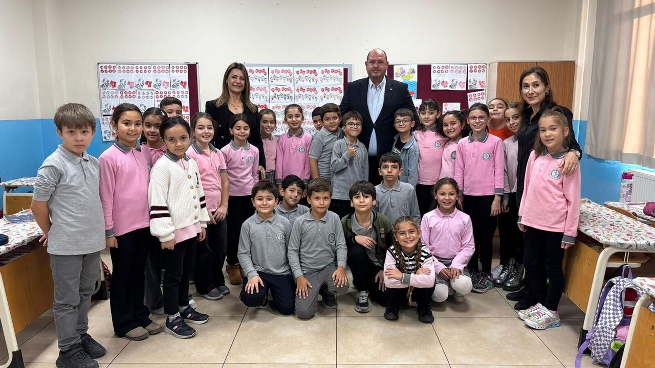 Menderes Belediye Başkanı İlkay Çiçek, Başkan Yardımcısı Miray Öre ve sınıf başkanı Azra Bozkurt’a sürpriz yaparak sınıfı ziyaret etti. Çocuklarla sohbet eden Çiçek, öğrencilerle fotoğraf çektirdi. Miniklerin yaşadığı heyecan ve mutluluk dikkat çekti.