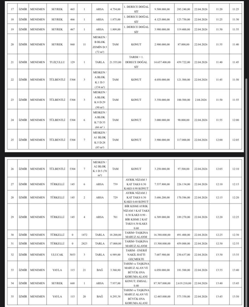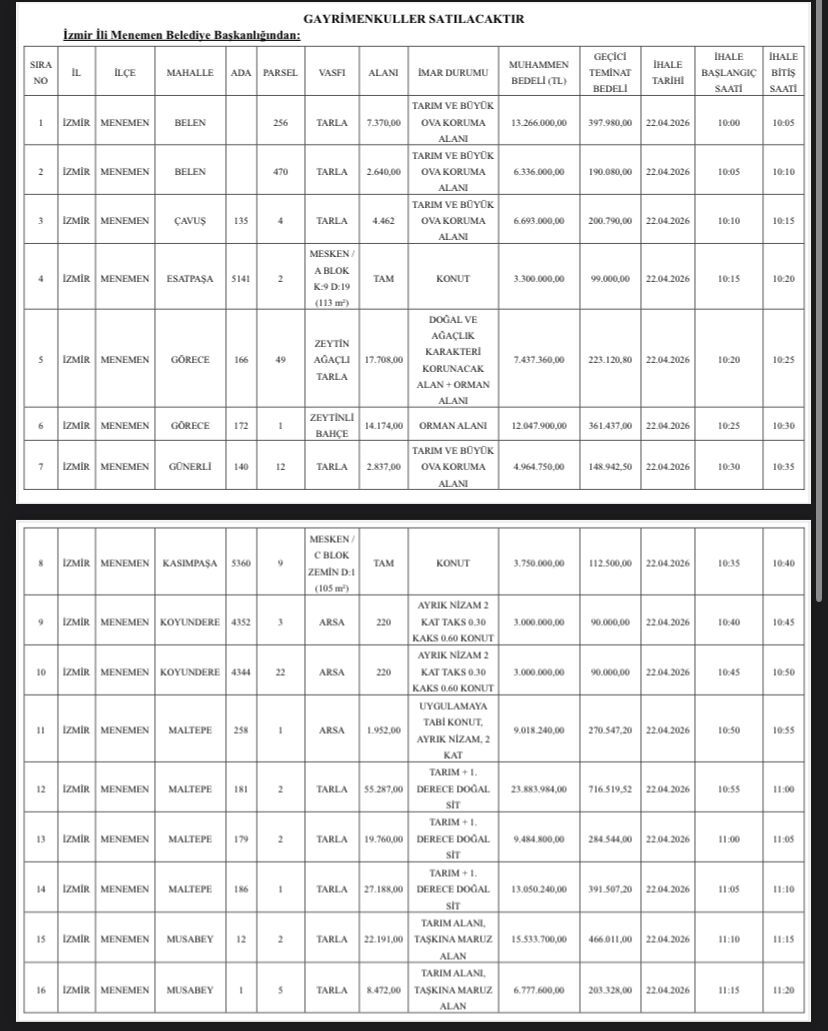 Son Mühür- İzmir’in ilçesi Menemen Belediyesi 35 taşınmazını satış için ihaleye çıkardı. 6 Nisan 2026 tarihli Resmî Gazete’de yayımlanan ilana göre satışlar, 22 Nisan 2026 tarihinde gerçekleştirilecek. Taşınmazlar arasında birçok ilçesinden tarla, zeytinlik, bağ, arsa ve konut niteliğindeki alanlar yer alıyor.