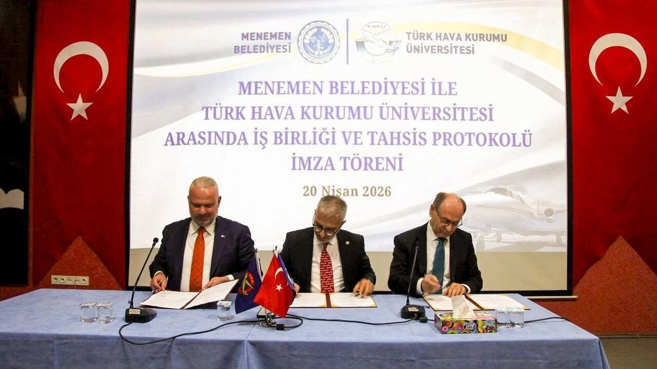 Kırmızı çizgimiz olan eğitimde bir eşiği daha aştık ve Menemen Belediyemiz ile Türk Hava Kurumu Üniversitesi arasında iş birliği ve tahsis protokolü imzalayarak, ilçemizde; eğitim, bilim ve teknoloji alanında yeni bir döneme adım atıyoruz" dedi.