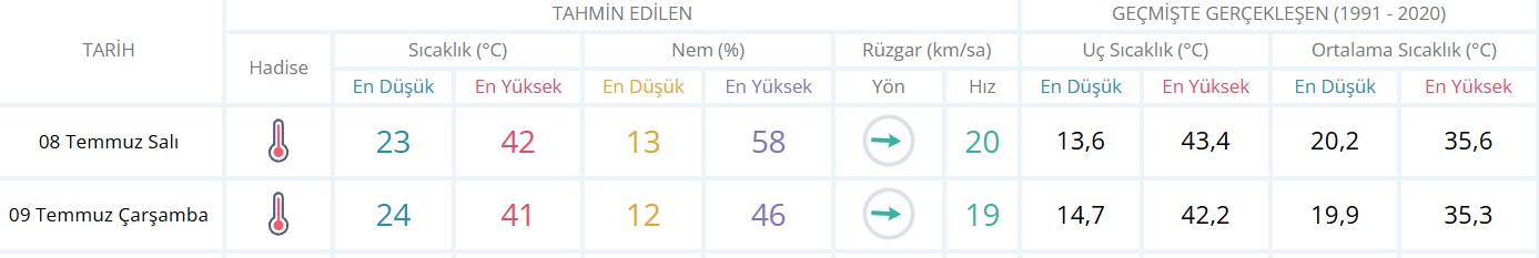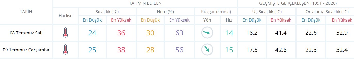 Salı günü (8 Temmuz) de bölgede hava az bulutlu ve açık olacak. Beklenen en düşük ve en yüksek sıcaklık değerleri şöyle: