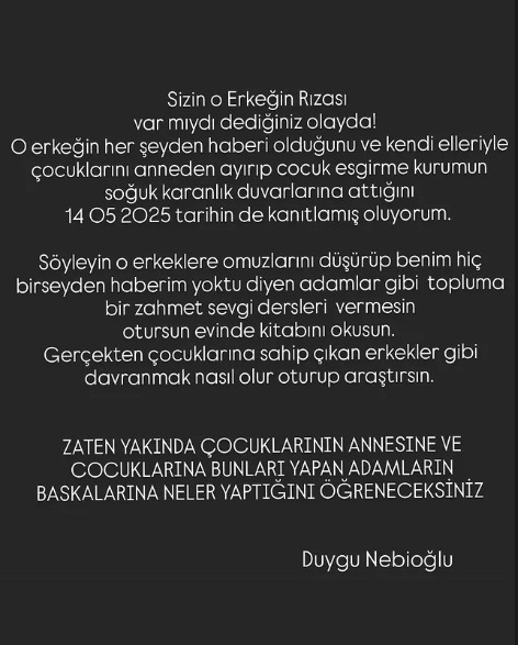 Nebioğlu, sosyal medya üzerinden yaptığı açıklamada, "Sizin o 'Erkeğin rızası var mıydı?' dediğiniz olayda, o erkeğin her şeyden haberi olduğunu ve kendi elleriyle çocuklarını anneden ayırıp çocuk esirgeme kurumunun soğuk, karanlık duvarlarına attığını 14 Mayıs 2025 tarihinde kanıtlamış oluyorum." ifadelerini kullandı.