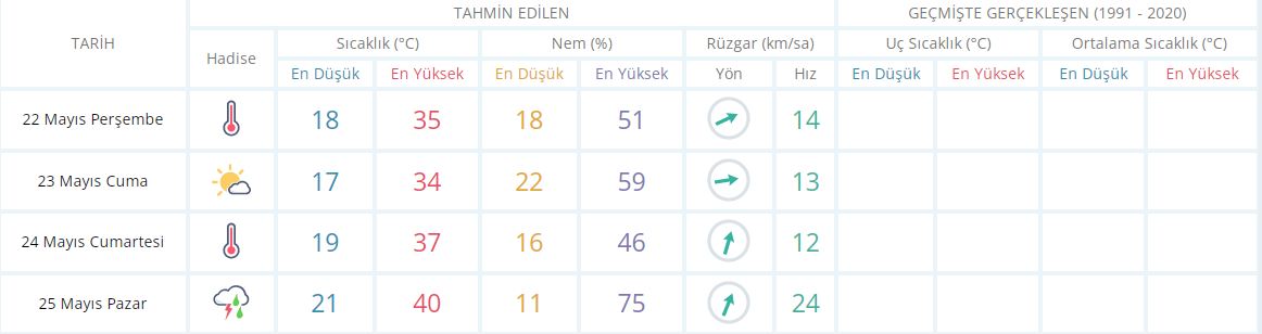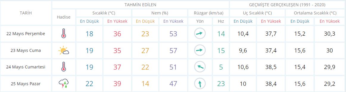 Pazar günü özellikle İzmir’in iç kesimlerinde sıcaklıkların 40-41 dereceye, Aydın’da 41-42, Manisa’da ise 41-42 dereceye ulaşması öngörülüyor. Hava sıcaklıklarının günlük 1-2 derece arasında kademeli artış göstereceği kaydedildi.