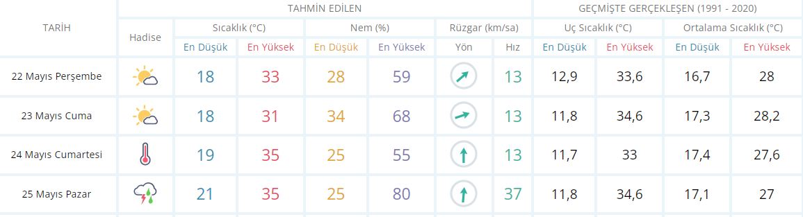 Perşembe günü İzmir’de sıcaklıklar 18 ile 33 derece arasında değişirken, Aydın’da 18-36, Manisa’da ise 18-35 derece aralığında seyredecek. Cuma günü ise İzmir’de 18-32, Aydın’da 19-34, Manisa’da 18-34 derece tahmin ediliyor. Bu yükseliş trendi Pazar gününe kadar sürecek.
