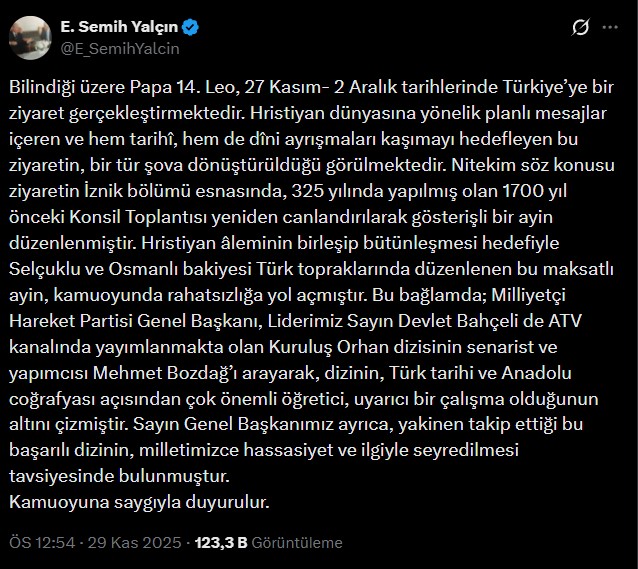 Yalçın, açıklamasının sonunda Papa’nın ziyaretinin içeriğine ve İznik’teki ayine dair eleştirilerini tekrar vurgulayarak, Bahçeli’nin diziye ilişkin değerlendirmesini kamuoyu ile paylaştı ve “Saygıyla duyurulur” notuna yer verdi.