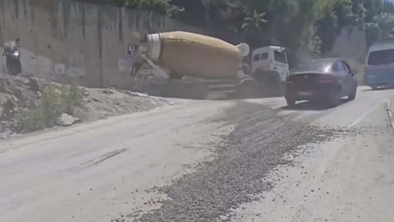 ÇAĞLAR DURSUN/SON MÜHÜR- İzmir Narlıdere’de hazır beton taşıyan mikserden sürücünün dikkatsizliği nedeniyle yüzlerce kilo hazır beton yola döküldü. Trafiğin yoğun olduğu bir noktada yola dökülen yüzlerce kilo beton araç sürücülerine zon anlar yaşattı