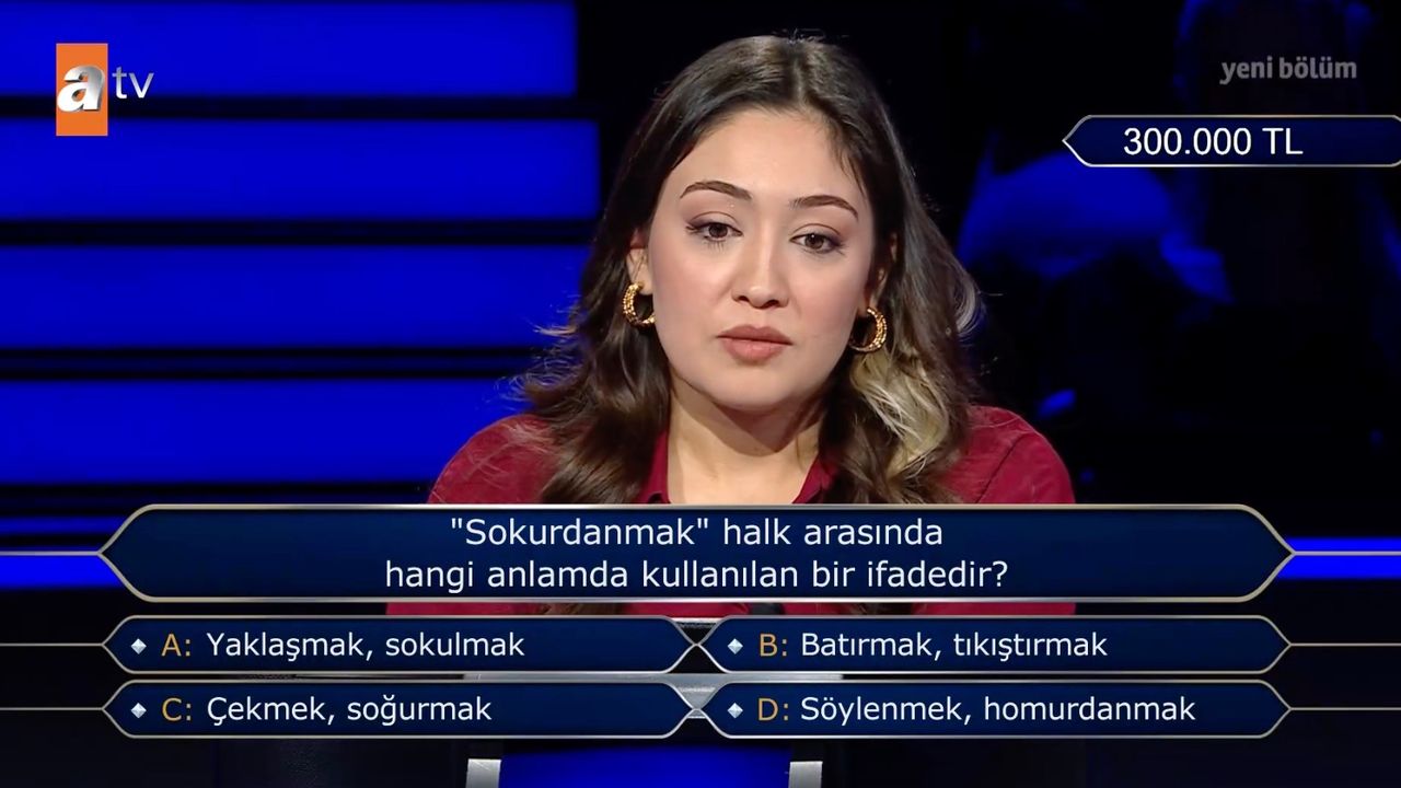 Kim Milyoner Olmak İster yarışmasında 300 bin lira değerinde soru ve cevabı merak ediliyor: Sokurdanmak halk arasında hangi anlamda kullanılan bir ifadedir.