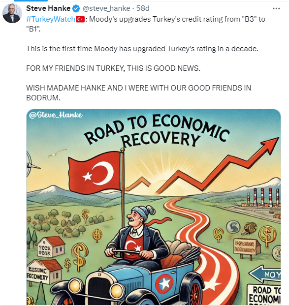 John Hopkins Üniversitesi'nin dünyaca ünlü akademisyenlerinden Steve Hanke bu hafta kelimenin tam anlamıyla gözünü Türkiye'den alamadı. Özellikle Türkiye'nin 'Nas Ekonomisine' geçiş yaptığı dönemde eleştirileriyle sık sık gündeme gelen Steve Hanke son bir hafta içinde üçüncü kez Türk ekonomisi üzerine mesaj verdi. Önce TÜK'in açıkladığı yıllık 71,6 oranındaki enflasyonu yıllık 30.3 olarak açıklayan Steve Hanke, güvenilir hesaplama yöntemleriyle yapmaya devam ettiği enflasyon hesaplamasında bu rakamı da revize ederek yıllık enflasyonu 26.6 olarak tespit ettiğini duyurdu. Mehmet Şimşek yönetimindeki ekonomi politikasına destek veren Steve Hanke'nin Türkiye üzerine üçüncü mesajı da Moddy'sin kredi notunu iki kademe birden yükseltmesi üzerine oldu. Son 10 yılda ilk kez Moddy's nor arttırdı hatırlatması yapan Steve Hanke bunun Türkiye'deki dostları için çok iyi bir haber olduğuna vurgu yaparak, hem kendisinin hem de eşinin Bodrum'da arkadaşlarıyla buluşmaya sabırsızlandığına dikkat çekti.