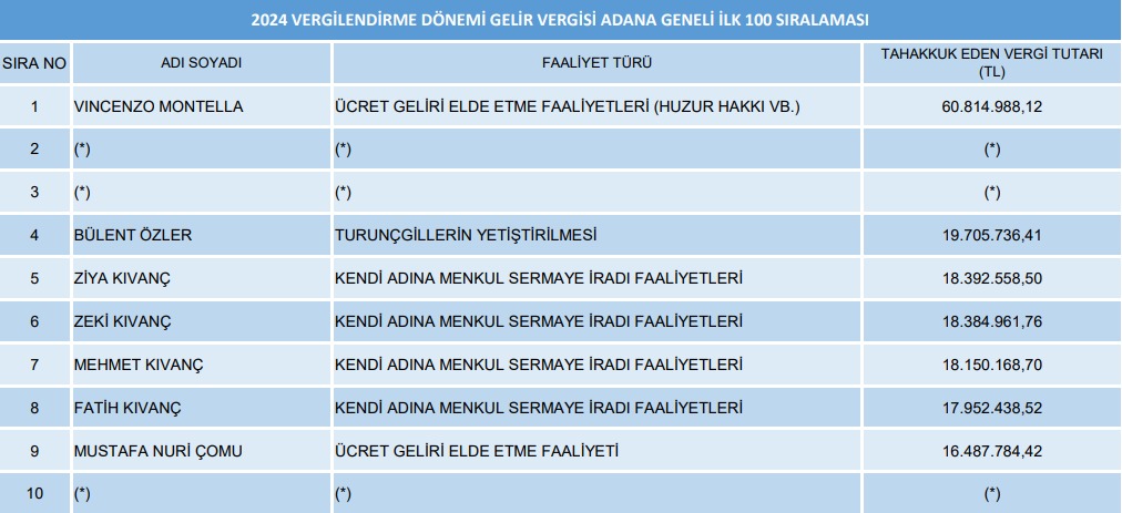 A Milli Takım Teknik Direktörlüğü görevine geçtikten sonra da, TFF’den aldığı maaş aynı mükellefiyet dosyası üzerinden işlem gördü. Böylece Montella, 2024 yılı gelir beyanında 60 milyon TL’yi aşan vergisiyle Adana’nın zirvesine yerleşti.,
