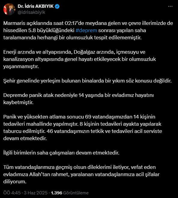 Muğla’nın Marmaris ilçesi açıklarında gece saat 02:17’de meydana gelen 5.8 büyüklüğündeki deprem, çevre illerde de güçlü şekilde hissedildi. Yetkililerden yapılan açıklamaya göre, sarsıntının ardından yapılan saha taramalarında şu ana kadar genel hayatı etkileyecek bir olumsuzluk tespit edilmedi.
