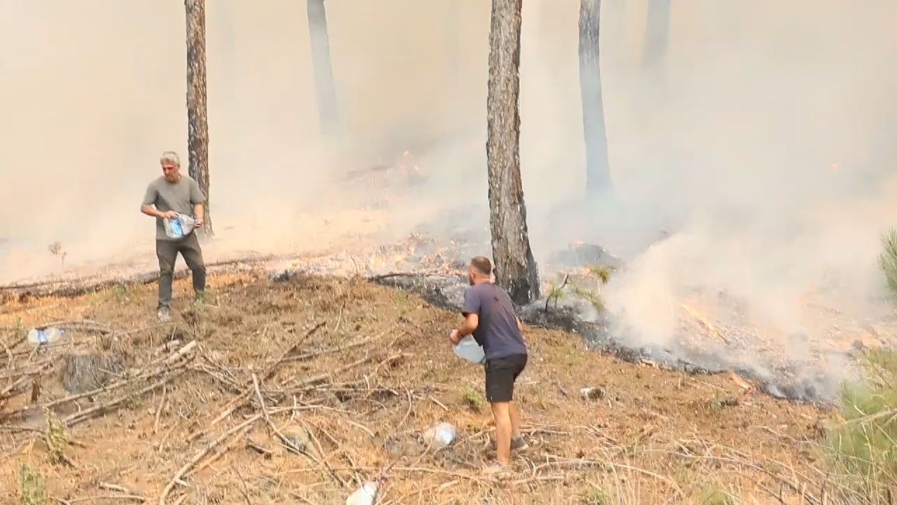 Bölge sakinleri damacanalar, kazma ve küreklerle yangın söndürme çabasında