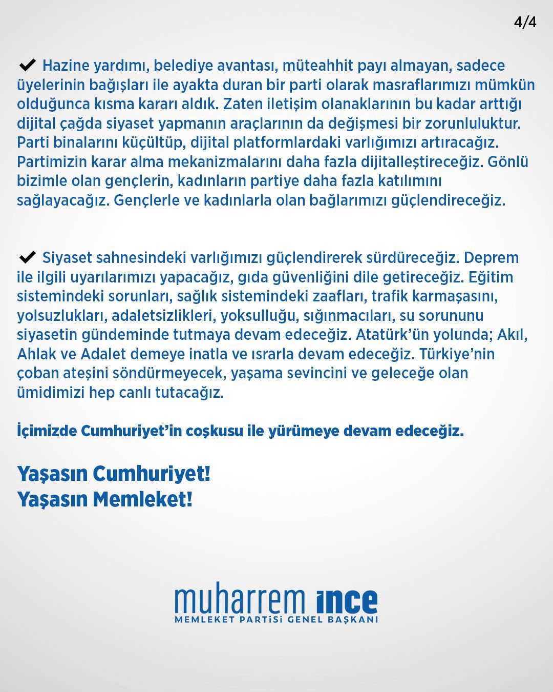 Memleket Partisi Genel Başkanı Muharrem İnce, seçimlerden sonra ilk açıklamasını yaptı. Sosyal medya hesabından açıklama yapan İnce, "Masrafları kısma kararı aldık" dedi.