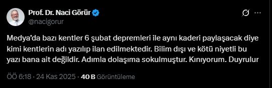 Görür, X hesabı üzerinden yaptığı açıklamada, medyada bazı kentlerin adlarının verilerek olası depremlerle ilişkilendirildiğini belirtti. Açıklamasında, “Bilim dışı ve kötü niyetli bu yazı bana ait değildir. Adımla dolaşıma sokulmuştur. Kınıyorum” ifadelerini kullandı.