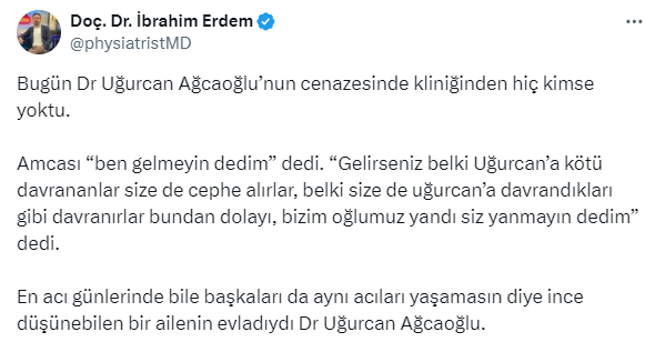 Do. dr. İbrahim Erdem sosyal medyadan paylaştığı mesajında gencecik yaşta yaşama veda eden Dr. Uğurcan Ağcaoğlu'nu ölüme götüren süreçle ilgili şu bilgileri paylaştı.