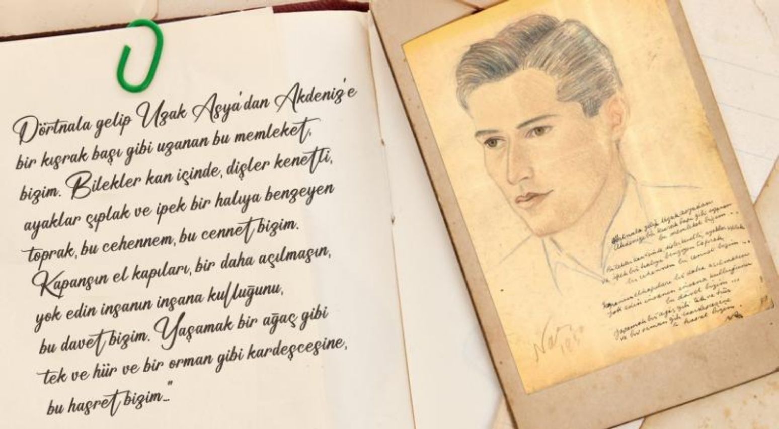 “Dörtnala gelip Uzak Asya'dan Akdeniz'e bir kısrak başı gibi uzanan bu memleket, bizim. Bilekler kan içinde, dişler kenetli, ayaklar çıplak ve ipek bir halıya benzeyen toprak, bu cehennem, bu cennet bizim. Kapansın el kapıları, bir daha açılmasın, yok edin insanın insana kulluğunu, bu davet bizim. Yaşamak bir ağaç gibi tek ve hür ve bir orman gibi kardeşçesine, bu hasret bizim...”