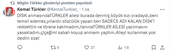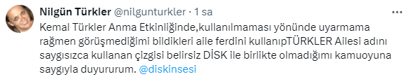 Eski Genel Başkan Kemal Türkler katledilişinin 44'üncü yıldönümünde DİSK, Topkapı Mezarlığı’nda Türkler’in mezarı başında bir anma programı düzenledi. DİSK Yönetim Kurulu ve Genel Başkanı Arzu Çerkezoğlu da Türkler’in mezarı başında bir konuşma yaptı. Ancak DİSK'in bu törenine tepki gösteren bir isim vardı. Kemal Türkler'in kızı Nilgün Türkler DİSK yönetiminin İYİ Parti Genel Başkanlığı döneminde Meral Akşener'i ziyaret ederek fotoğraf çektirmesine tepki göstererek DİSK'in babası için düzenlediği anma törenine katılmadı.