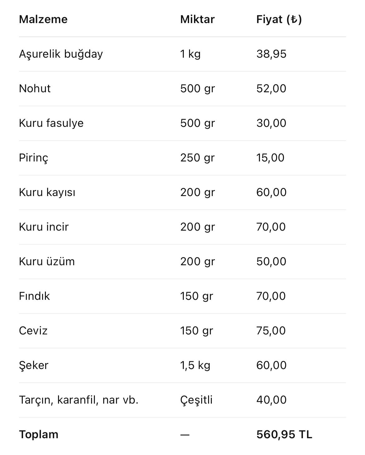 Artan gıda fiyatları, aşurenin özellikle süsleme ve lezzet katkısı sağlayan malzemelerinde belirgin şekilde hissediliyor. Kuru incir, kayısı, fındık ve ceviz gibi ürünlerin fiyatları, toplam maliyetin neredeyse yarısını oluşturuyor. Sadece 150 gram ceviz 75 TL’ye, fındık ise 70 TL’ye kadar çıkıyor.