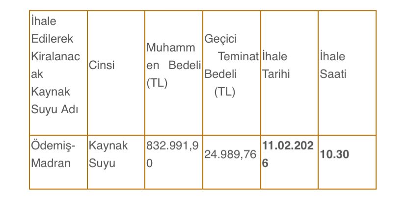 Son Mühür- İzmir Valiliği Yatırım İzleme Koordinasyon Başkanlığı, Ödemiş’in Bozdağ Mahallesi’nde bulunan Madran kaynak suyunun kiralanacağını açıkladı. Kiralanacak kaynağın debisinin saniyede 0,2 litre olduğu belirtilirken, ihalenin bedeli 832 bin 991 TL olarak duyuruldu. İhale, 11 Şubat tarihinde İzmir Valiliği Yatırım İzleme ve Koordinasyon Başkanlığı’nda gerçekleştirilecek.