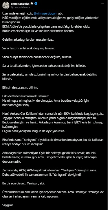 "Arkadaşın bize zulmediyor. Öyle bir noktaya geldik ki susmak, onunla birlikte kamçı vurmak gibi artık." diyen Canpolat, Erdoğan'ın etrafında kendisine "Yanlışsın!" diyebilecek kimse bırakmadığını savundu. Canpolat, "Üzerimdeki tüm emeklerin için teşekkür ederim. Ama istemeye istemeye de olsa seni arkadaşının yanına kaldırıyorum. Saygılar." diyerek, Yılmaz Erdoğan'la olan bağını kopardığını ima etti.