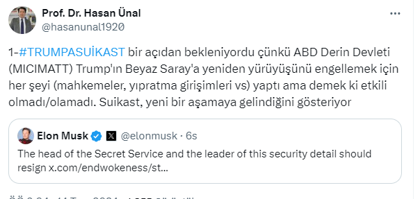 'Donald Trump'a suikast bir açıdan bekleniyordu çünkü ABD Derin Devleti (MICIMATT) Trump'ın Beyaz Saray'a yeniden yürüyüşünü engellemek için her şeyi (mahkemeler, yıpratma girişimleri vs) yaptı ama demek ki etkili olmadı/olamadı. Suikast, yeni bir aşamaya gelindiğini gösteriyor' hatırlatmasında bulunan Hasan Ünal, 'görgü tanığı tüfekli/şüpheli bir adamın çatıya tırmandığını gördüğünü ve bu durumdan güvenlik güçlerini ve gizli servisi haberdar ettiğini/etmeye çalıştığını ama polis ve gizli servisin ilgilenmediğini; dakikalar içinde suikast girişiminin olduğunu anlatıyor. Anlattığına göre şahsın Trump'a ateş etmesinden dakikalar sonra aynı güvenlik güçlerinin suikastçıyı öldürdüklerini gördüğünü de ilave ediyor. Muhtemelen amatör bir girişim olarak değerlendirilmeye çalışılacaktır oysa iyi organize edilmiş gibi. Esas mesele küreselci elitin Trump'ın gelişini engellemek istemesi. Demokrasi karşıtı gibi gösterilmesi halkta yeterli karşılık bulamadı. Özel hayatına ilişkin dedikodular/iftiralar da öyle. Mahkemeler vs yolunu kesmedi...' mesajı verdi.